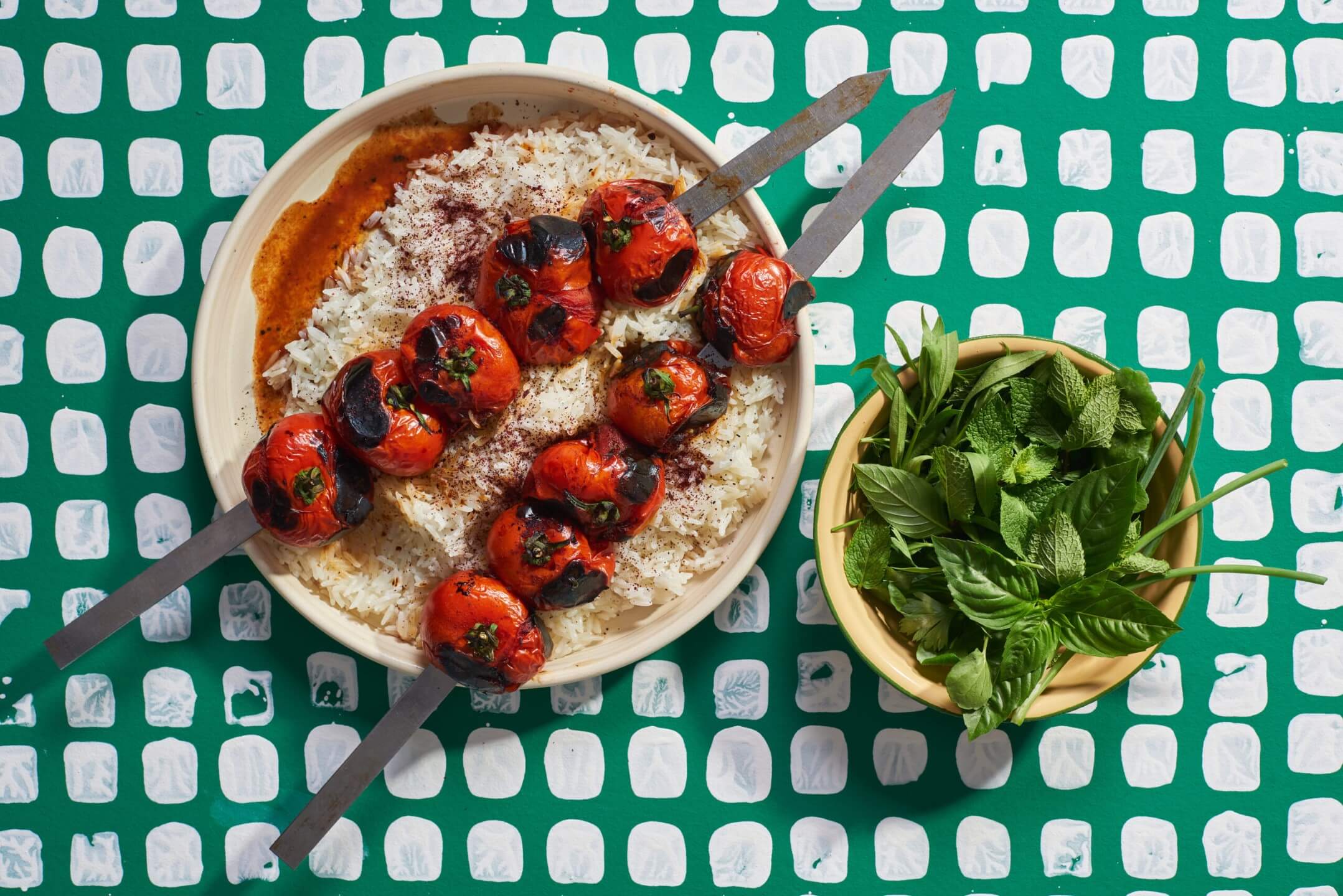 - نضع الطماطم المشويّة فوق الأرز وثمّ نقسّمها. نرشّ السمّاق والملح ونقطّر عليها زيت الزيتون.