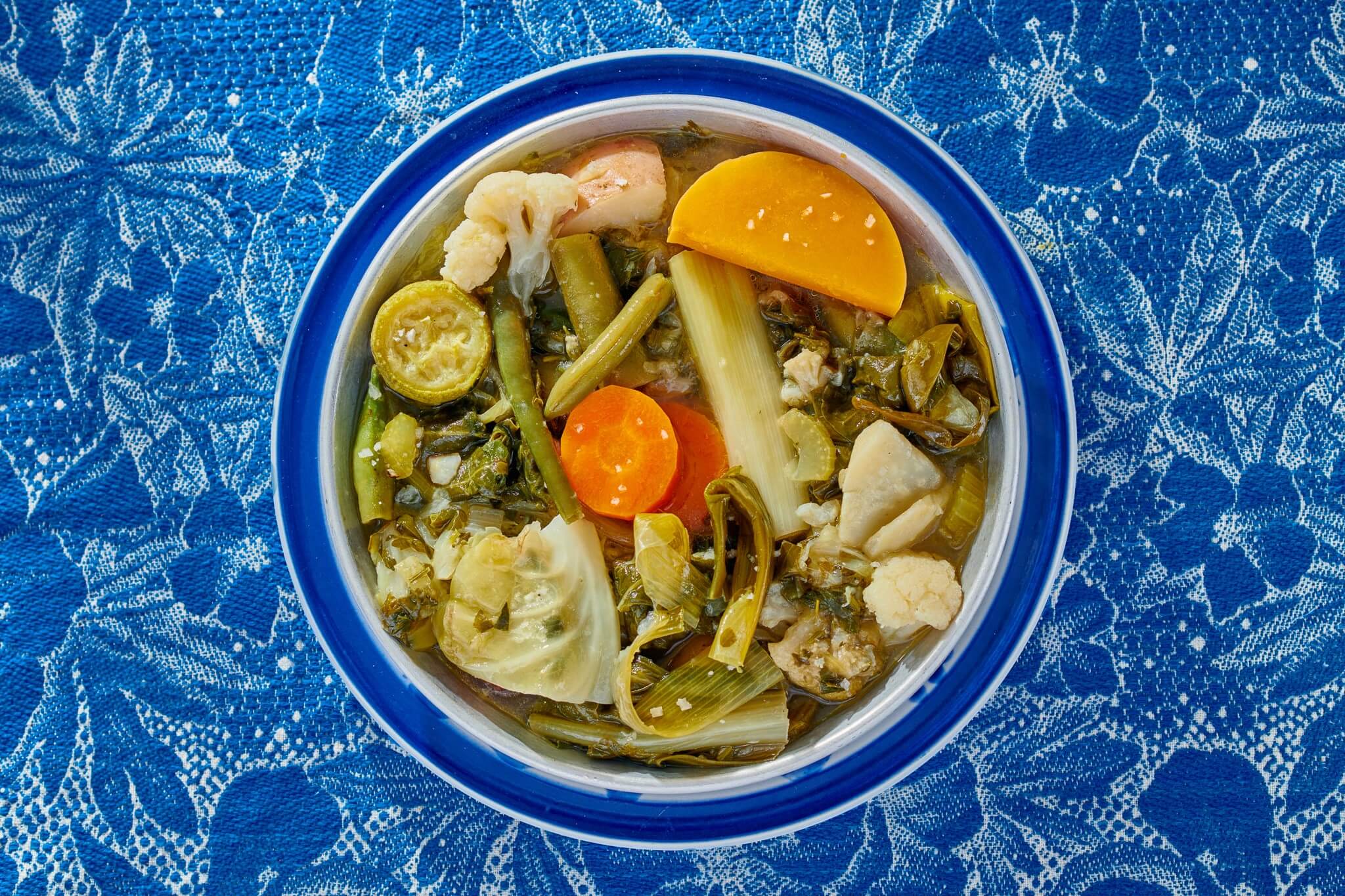 يجمع الطبق بين لحمة الرأس وخضار ربيعية موسمية تطهَى معًا في طهي بطيء وطويل. يمكنكم تناول الطبق كما هو أو تقديمه مع الأرز.